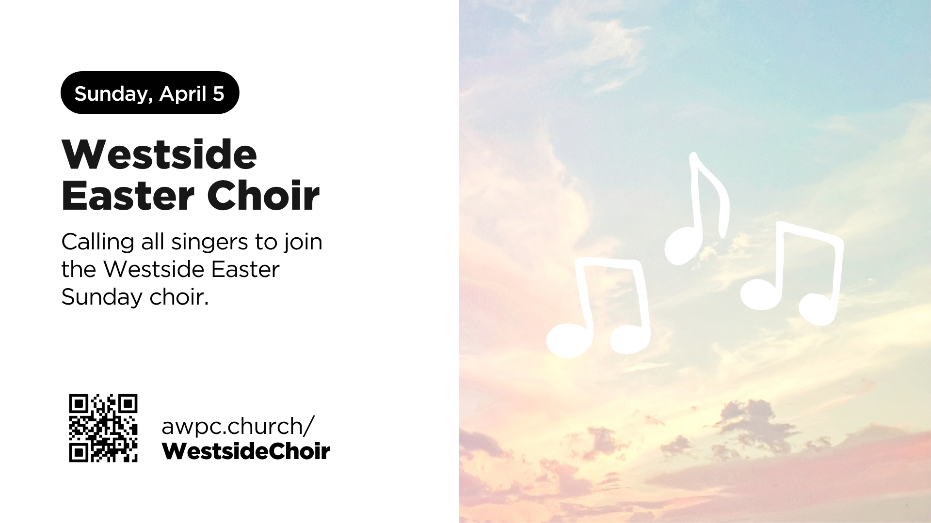 Do you love to sing? Looking for a unique way to celebrate Easter? Consider being a part of Westside’s Easter Choir! There will be two rehearsals before Easter Sunday.